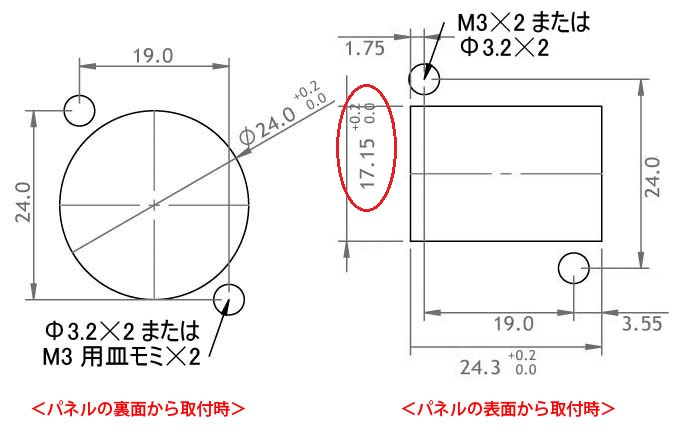 ●パネルや壁面への取り付けは、M3サイズの皿小ネジ2本を使用します(取付ピッチやパネルカット寸法は右上リンクの図をご参照ください)。なおパネルへの取付方向によってパネルカット形状が異なりますのでご注意ください。 下記の左図はパネルの裏面方向から取付時、右図はパネルの表面方向から取付時のカット寸法です。