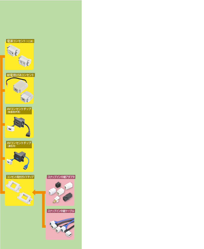 電源コンセント(1口用) 給電用USBコンセント AVコンセントチップ(映像音声用) AVコンセントチップ(通信用) コンセント取付ガイドチップ スナップイン中継アダプタ スナップイン中継ケーブル