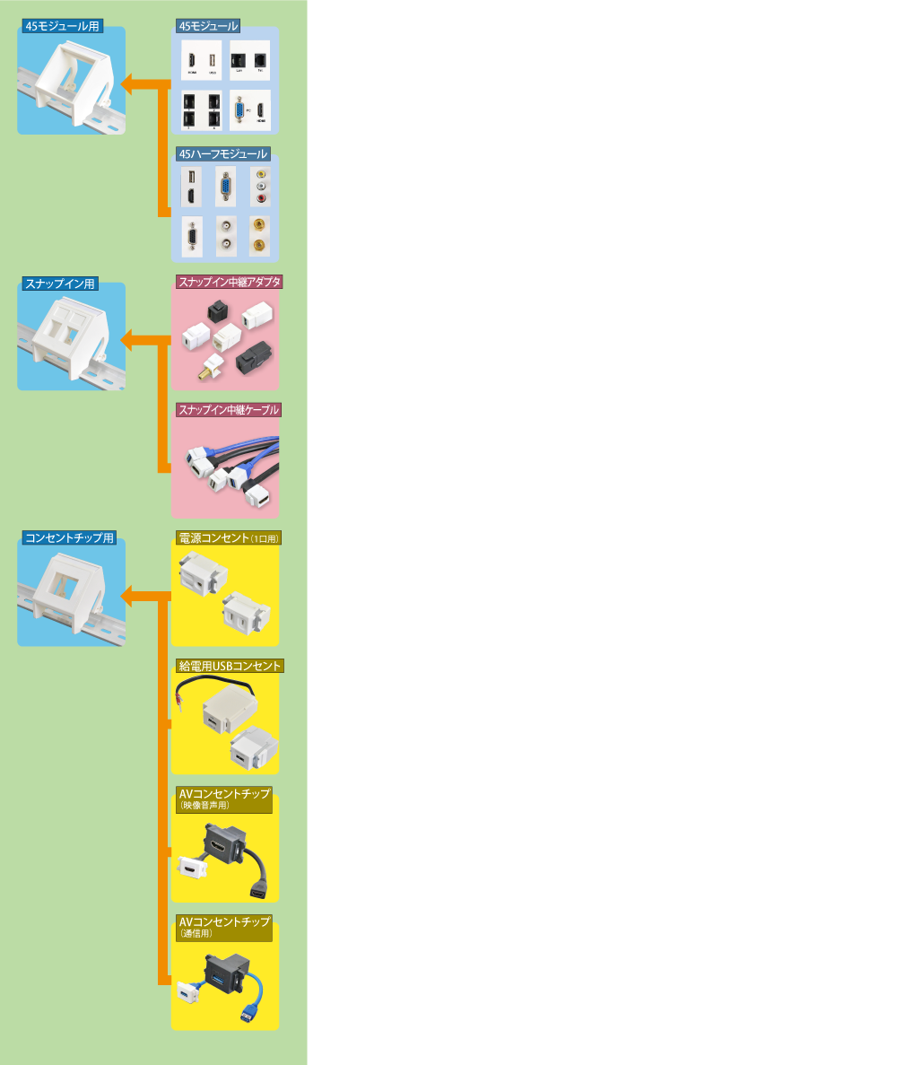 45モジュール用 スナップイン用 コンセントチップ用 45モジュール 45ハーフモジュール スナップイン中継アダプタ スナップイン中継ケーブル 電源コンセント(1口用) 給電用USBコンセント AVコンセントチップ(映像音声用) AVコンセントチップ(通信用)