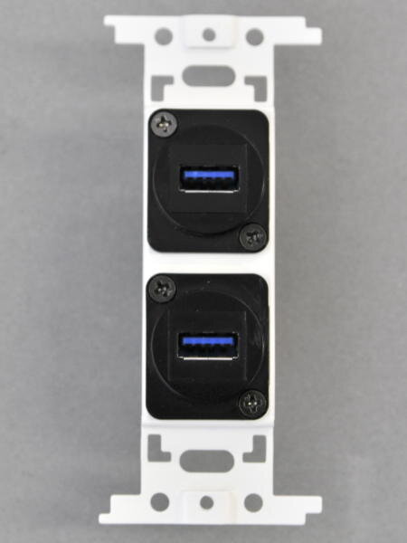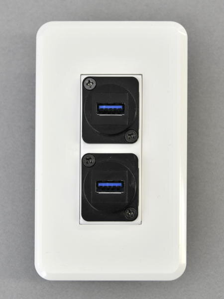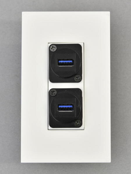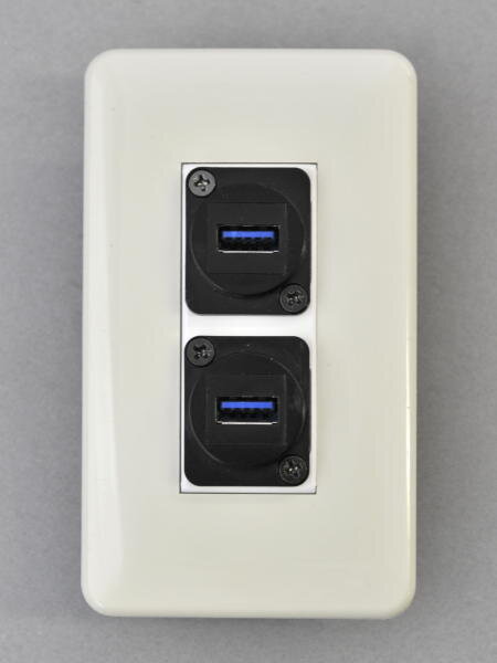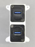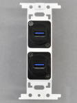 ●専用のモジュール枠にノイトリック社のDLXシリーズにサイズを合わせたパネルマウントタイプのUSB端子(USB3.0対応両側Aタイプ メス)PMNST-USB3ACR-BKを2つ組み込んだ商品です。