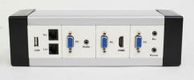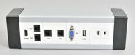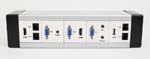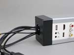 ●45モジュール(45㎜×45㎜サイズ)や45ハーフモジュール(45㎜×22.5㎜サイズ)のHDMIなどのAV信号やUSB、LANなどの通信信号の複合端子モジュールを端子を自由に組合せて、机上や床、壁などにAV端子を設置できる専用配線ボックスです(組立事例写真はこちら、 およびこちら)。