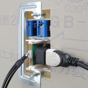 ※専用フェースプレートを使って壁面へ取り付ける際には、差し込みケーブルの方向が90°アングル方向になりますので壁厚が10㎜以下でないとケーブルが干渉し差し込めません(写真)。壁厚、ケーブルのコネクタモールド部など十分ご考慮ください。