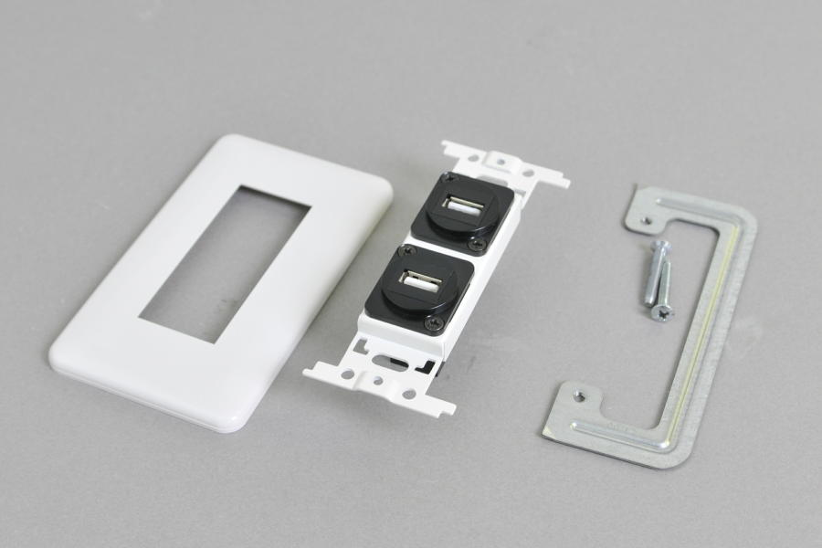 ●フルカラープレート(パナソニック製WN6003SW:ホワイト色)と取付枠一体型コンセントモジュール(CMW-2PNUSBA-BK)をセットした商品です。取付に必要なコの字型ハサミ金具(パナソニック製WN39929)までセットにした商品です。
