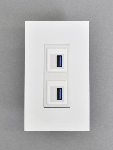 コンセントモジュールのカラーバリエーションは白色のみになります。フェースプレートとの組み合わせの際には、メーカーにより白色の色味は変わりますのでご注意ください。(各社の組み合せ例はこちら)