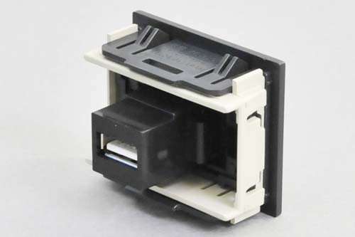 ●クロ色のUSB2.0-A端子のスナップイン中継コンセントとクロ色の取付ガイドチップSY-NWT-KV-BKのセット商品です。
