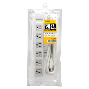 【サンワサプライ】 電源タップ(熱に強い構造、簡易パッケージタイプ、3P・6個口、15A・125V(合計1500Wまで)、2Pスイングプラグコード2.5m付き)【在庫限り販売中止】