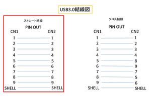●市販の両側オスのUSB3.0ケーブルで多く採用されているクロス結線とは異なり、本製品の内部結線は同一ピンどうしの全線ストレート結線です。クロス結線ではないため、クロス結線タイプのスナップイン中継コネクタやコンセントチップには使用できませんので、お間違いの無いようご注意ください。