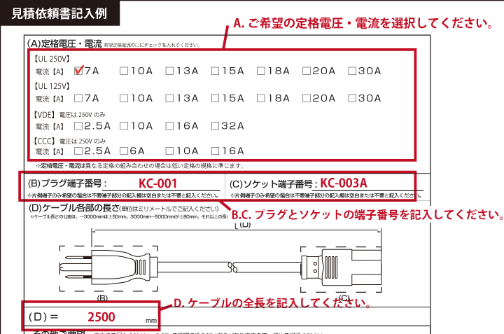 BおよびCに記入するプラグ端子とソケット端子の仕様は、以下の電源コード(海外向け)カテゴリーから確認できます。希望する端子の端子番号をBおよびCに入力または記入してください。