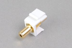 スナップイン中継コネクタ 両側3.5mmステレオミニソケット端子、背面アングル方向配線引き出しタイプ、白●音声信号の伝送に一般的に使われている3.5mmステレオミニ端子のスナップイン中継コネクタです。 |